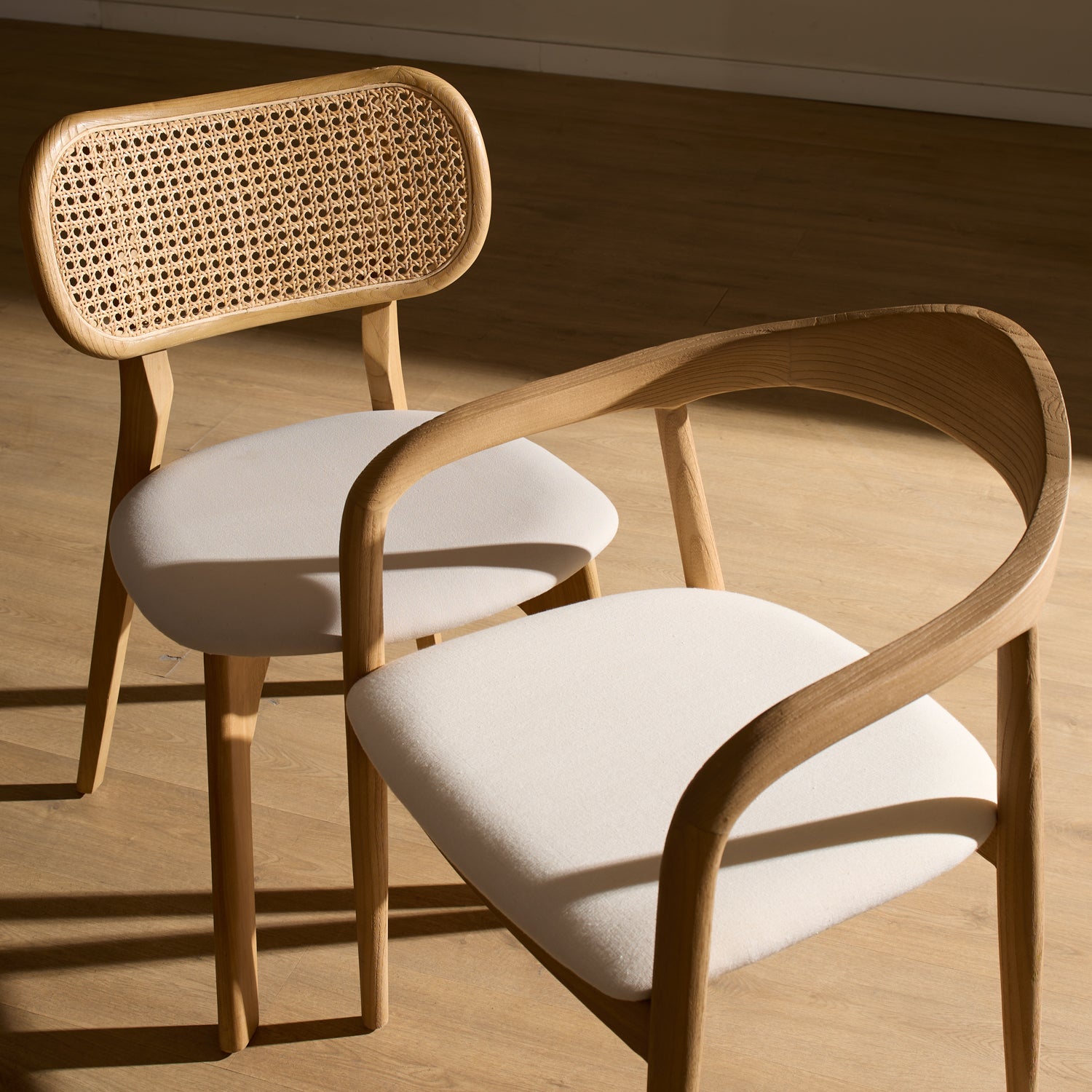 Upholstered dining chair made of solid Sungkai wood and hand-braided rattan grating