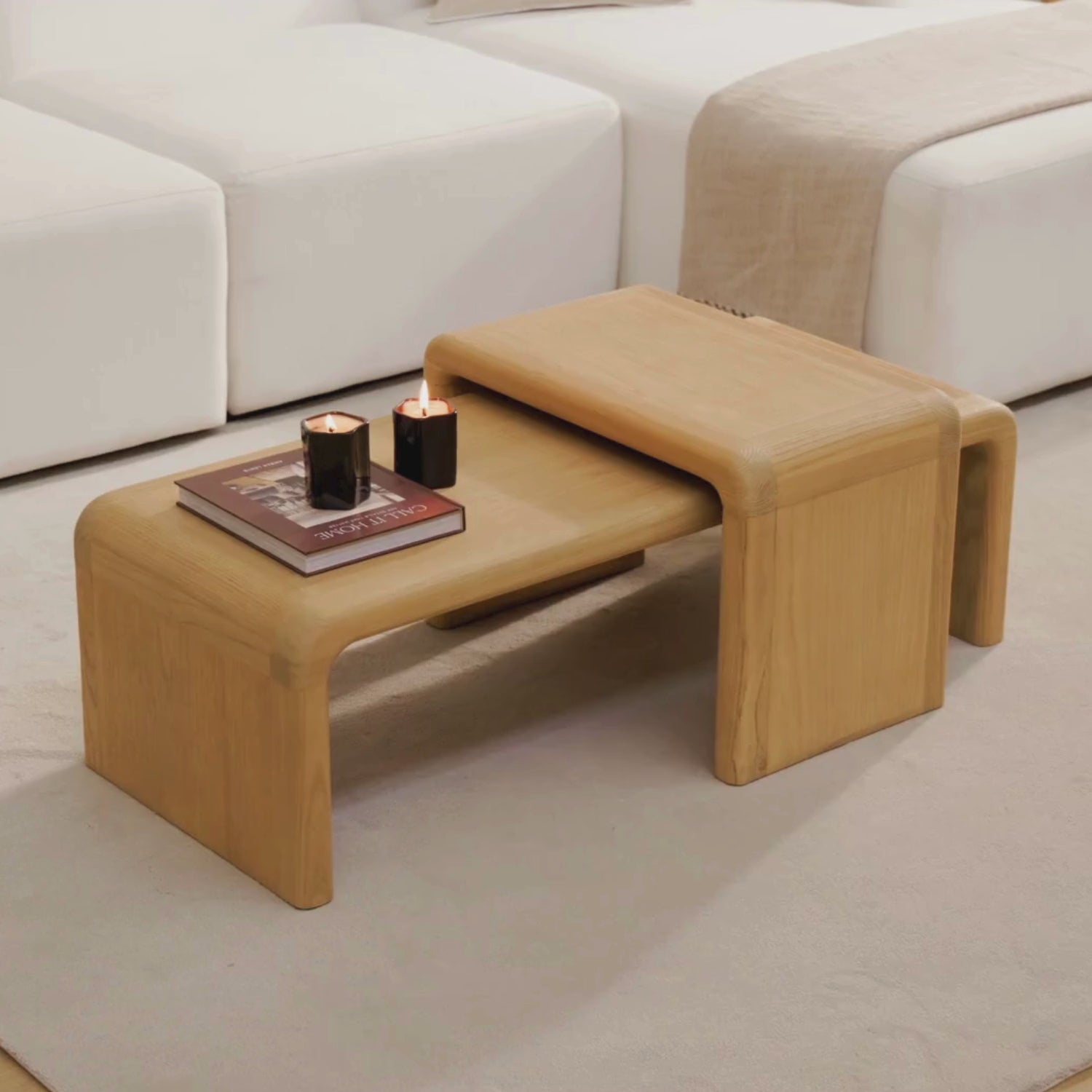 La gran ventaja de este conjunto es su versatilidad: puedes usarlas juntas, superponiendo ligeramente una sobre la otra para crear una composición escalonada como mesa de centro. O bien, utilizarlas por separado, empleando la mesa más pequeña como mesa auxiliar junto a un sillón o sofá.