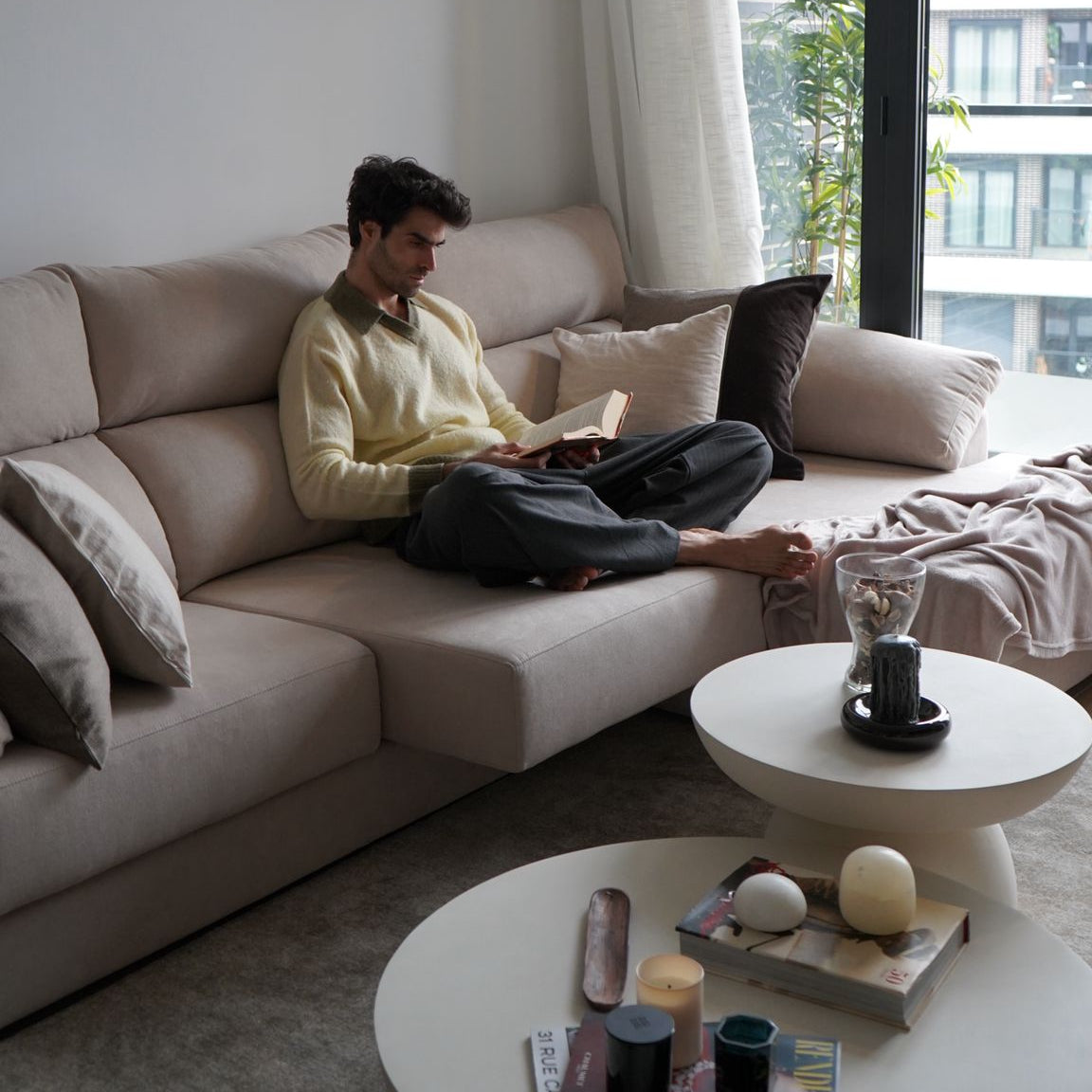Dans le salon de Juan, le canapé Melati n'est pas seulement pratique, il façonne aussi l'atmosphère de l'espace. Un canapé avec méridienne, conçu pour durer, pour être vécu, et pour s'accorder au rythme paisible d'une maison où confort et sérénité règnent en maîtres. Pour Juan, le canapé Melati est ce refuge où il revient toujours. Un lieu où son corps se détend presque instinctivement et où son esprit trouve un havre de paix.