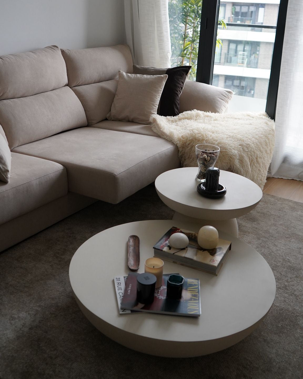 Les tables basses Koh and Tao, réalisées en microciment, deviennent la pièce maîtresse du salon. Leur présence, à la fois sereine et saisissante, évoque une sculpture qui se suffit à elle-même. Le microciment lui confère une texture organique, subtilement imparfaite, en écho à la philosophie du wabi-sabi : la beauté du naturel et de l’imperfection.