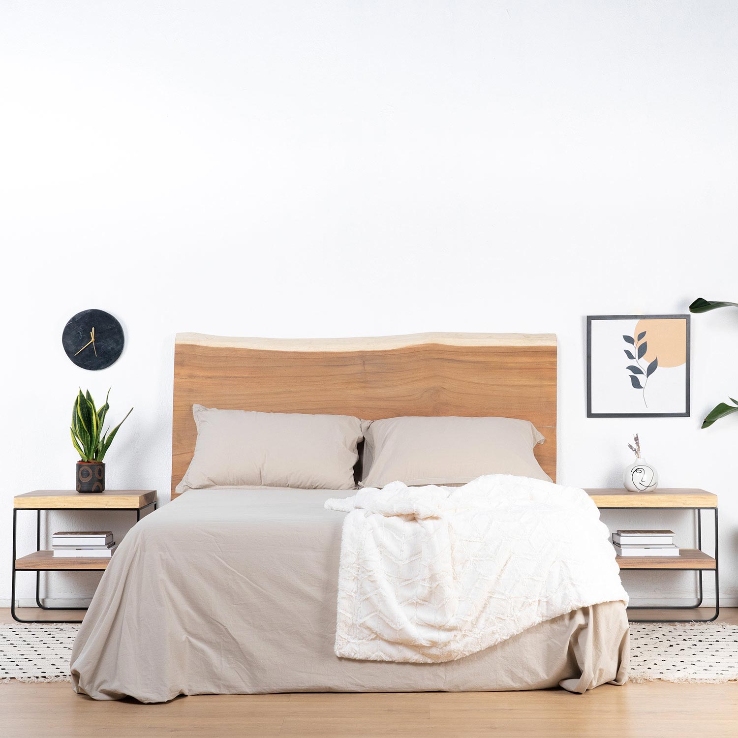 Madera maciza de Trembesí y hierro texturizado.