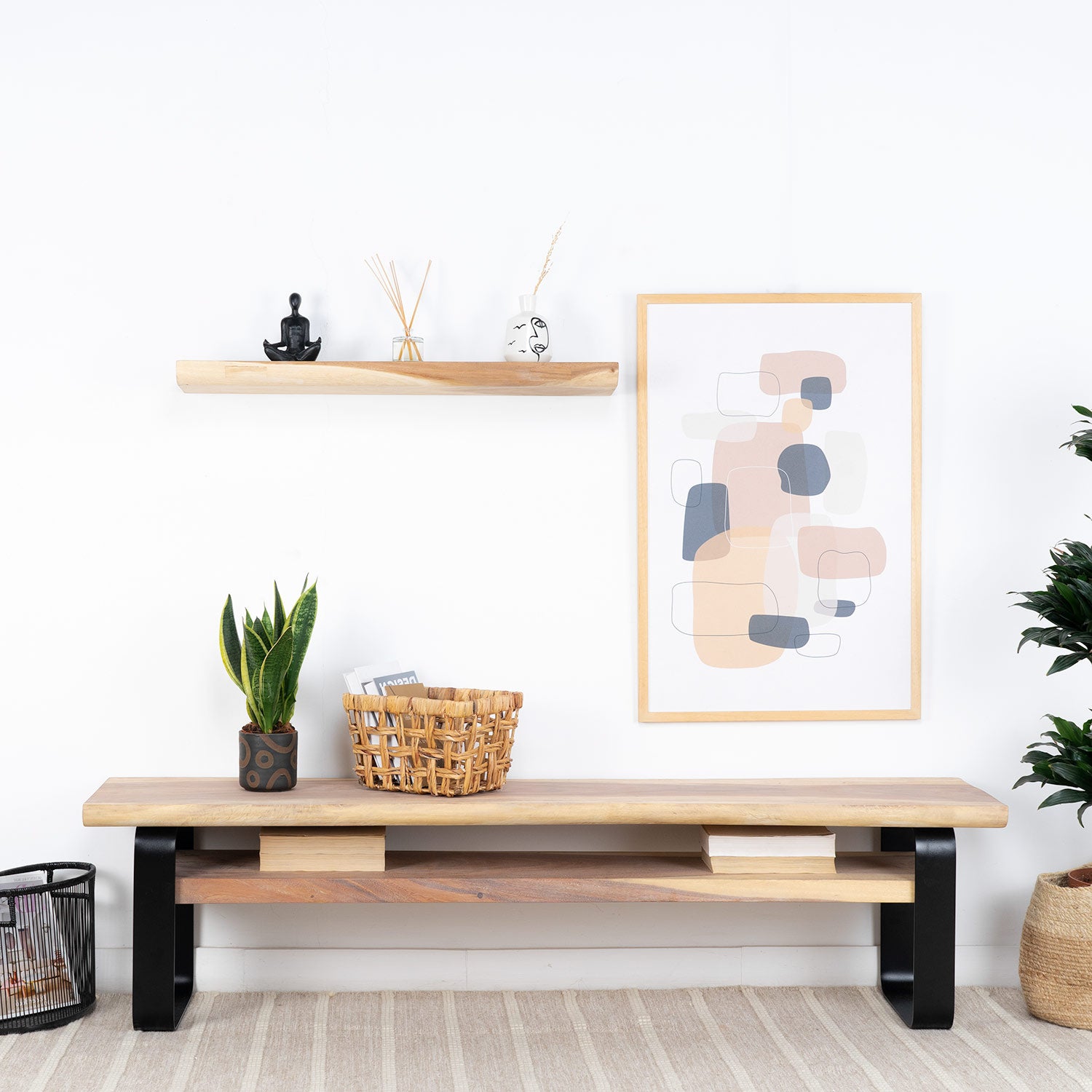 Nayi, un mueble de TV con el que crear un salón cálido gracias a la madera de trembesí. Dispone de dos baldas para conseguir un mayor almacenaje y espacio para colocar decoración. Combínalo con el resto de la colección y consigue un salón único.