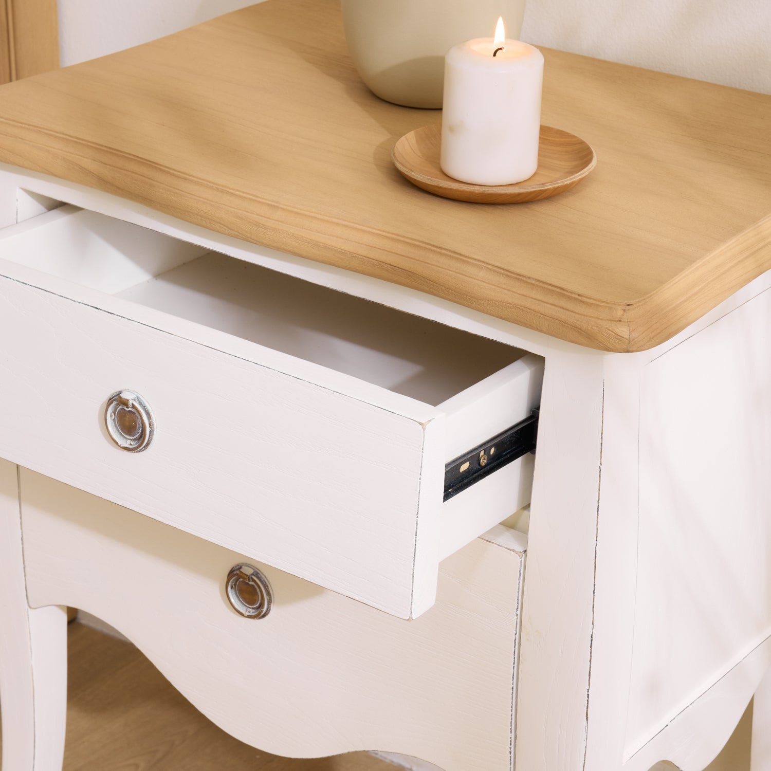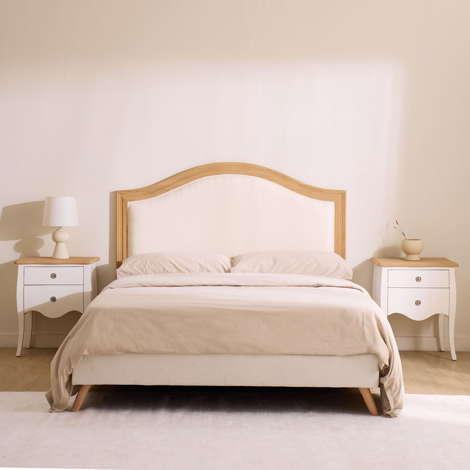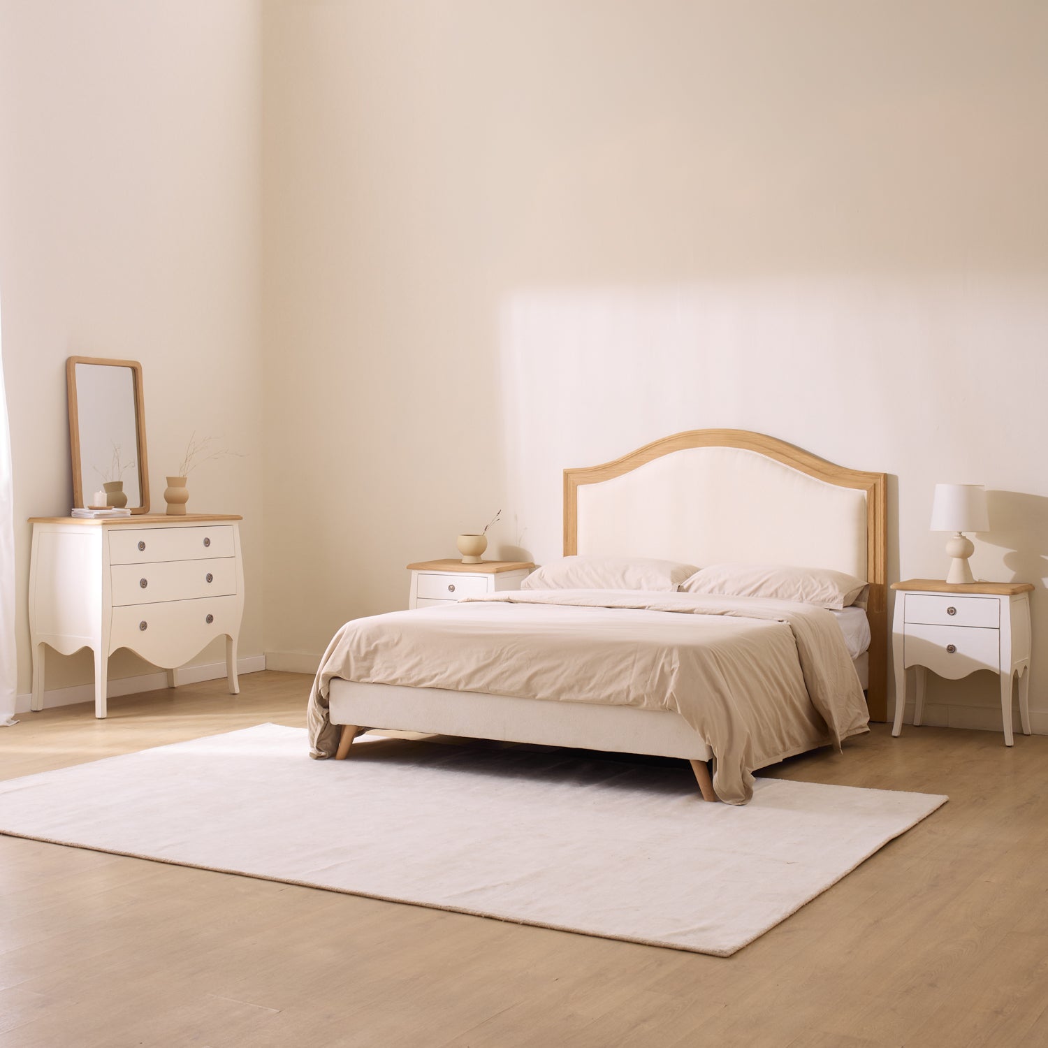 Las mesitas de noche Mani completan el conjunto con su diseño curvo y tintado blanco que evoca el romanticismo clásico. Fabricadas en madera maciza de Sungkai, incorporan dos cajones espaciosos con tiradores metálicos, ideales para mantener tu espacio en orden sin renunciar al estilo.