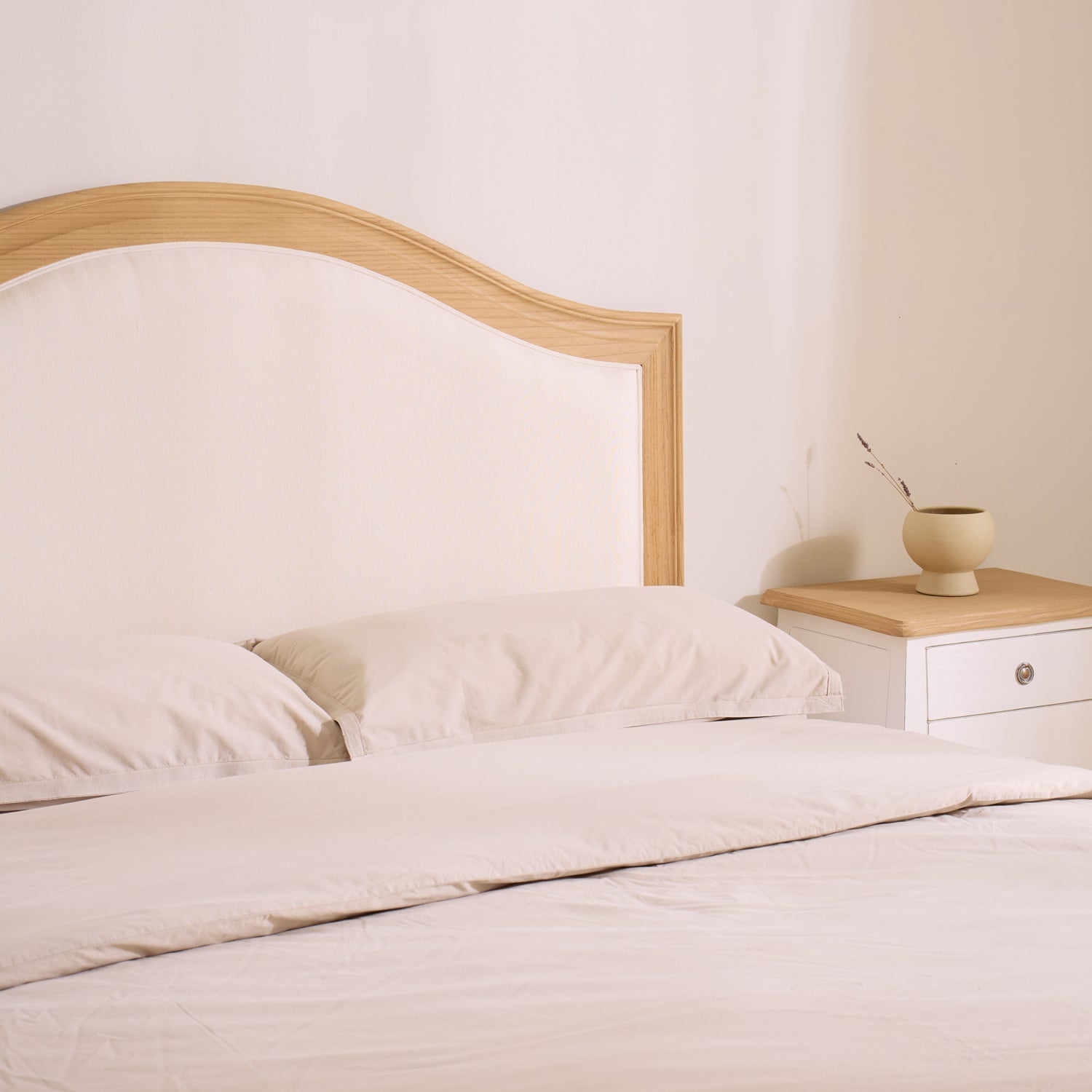 El cabecero tapizado Mani, tapizado en un delicado tono beige, destaca por su acabado mullido y líneas suaves, aportando confort visual y una sensación de abrigo perfecta para el descanso. Su diseño atemporal lo convierte en una pieza fácil de integrar tanto en dormitorios de estilo romántico como en ambientes más contemporáneos.